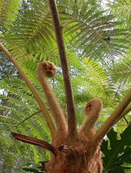 名稱:筆筒樹別名:筆筒樹、蛇木科別:桫欏科(樹蕨科)學名:Alsophila spinulosa特徵:樹蕨喜歡在溫暖潮濕,雨量充沛的環境生長。於臺灣各地山麓至海拔1800公尺之潤濕森林內十分普遍。蕨葉由三回羽裂至三回羽狀複葉,叢生莖頂,最小羽片常覆蓋最小羽軸。樹蕨的樹幹筆直,上有鮮明葉痕。下半部密被氣根狀黑褐色維管束群,樹幹鋸短挖空可當筆筒,亦稱為蛇木,黑色的氣根為養蘭重要的資材 。 介紹:筆筒樹和桫欏等蕨類,常被稱為樹蕨。因為他們和大部分低矮或附生的蕨類不同。他們有像樹一般的莖,因此可以說是蕨類中的巨人。在博嘉國小的後山,有許多高大的筆筒樹。在台灣的東北部,有相當多的筆筒樹族群。
