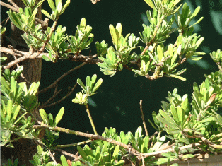中庭的羅漢松有兩種,葉子較大植株較高的是原產於日本南部、琉球及中國西南的羅漢松,另有二棵風姿樸雅植株袖珍的是蘭嶼羅漢松,原產於蘭嶼東清村附近,原生地幾乎絕種,民國77年農委會與經濟部公告,將其列為台灣珍貴稀有的植物。幸好近年來,台灣本島己大量繁殖,全省普遍栽培,成樹為高級庭園樹。學名:Podocarpus costalis Presl. 分類:羅漢松科Podocarpaceae 外型特徵: 1.風姿樸雅的蘭嶼羅漢松,是一種常綠性的小灌木,全株很少超過五公尺。 2.葉:葉叢生枝端,單葉橢圓線形,先端鈍或圓,葉略為反捲,下背面皆平滑,葉厚硬革質,濃綠富光澤;中肋明顯,無葉柄。 3.花:夏天盛開黃綠色的小花,開花時不甚明顯,沒有花瓣和花萼。 4.果實:果實為深黑色,基部有一個肉質的果托。 5.種子:種子核果狀,著生於肥大肉質的種托上,種托成熟深黑色,種子橢圓形,外形如著袈裟的羅漢,故名羅漢衳。生長特性: 1.蘭嶼羅漢松為台灣原生植物,原產於東部蘭嶼的岩礁上,以及菲律賓的巴丹群島。 2.蘭嶼羅漢松為常綠灌木,雌雄異株,雄花毬果狀,雌花單生葉腋。 功用: 1.葉簇四季常青有生氣盎然之感,莖枝蒼枝挺拔,風姿樸雅,幼株可盆栽;亦可加以整形成圓形、錐形或高貴盆景。 2.雅美族語balobo,昔日曾製拼板舟,現今數量稀少,僅生長於五孔洞、老人岩的陡崖之上。